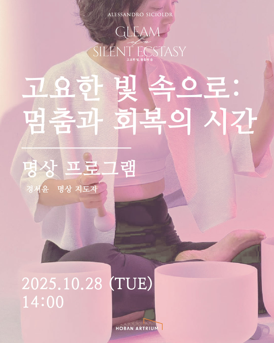 호반아트리움은 오는 10월 28일, 《Gleam of a Silent Ecstasy: 고요한 빛, 황홀의 틈》의 연계 프로그램으로 명상 프로그램을 진행합니다.