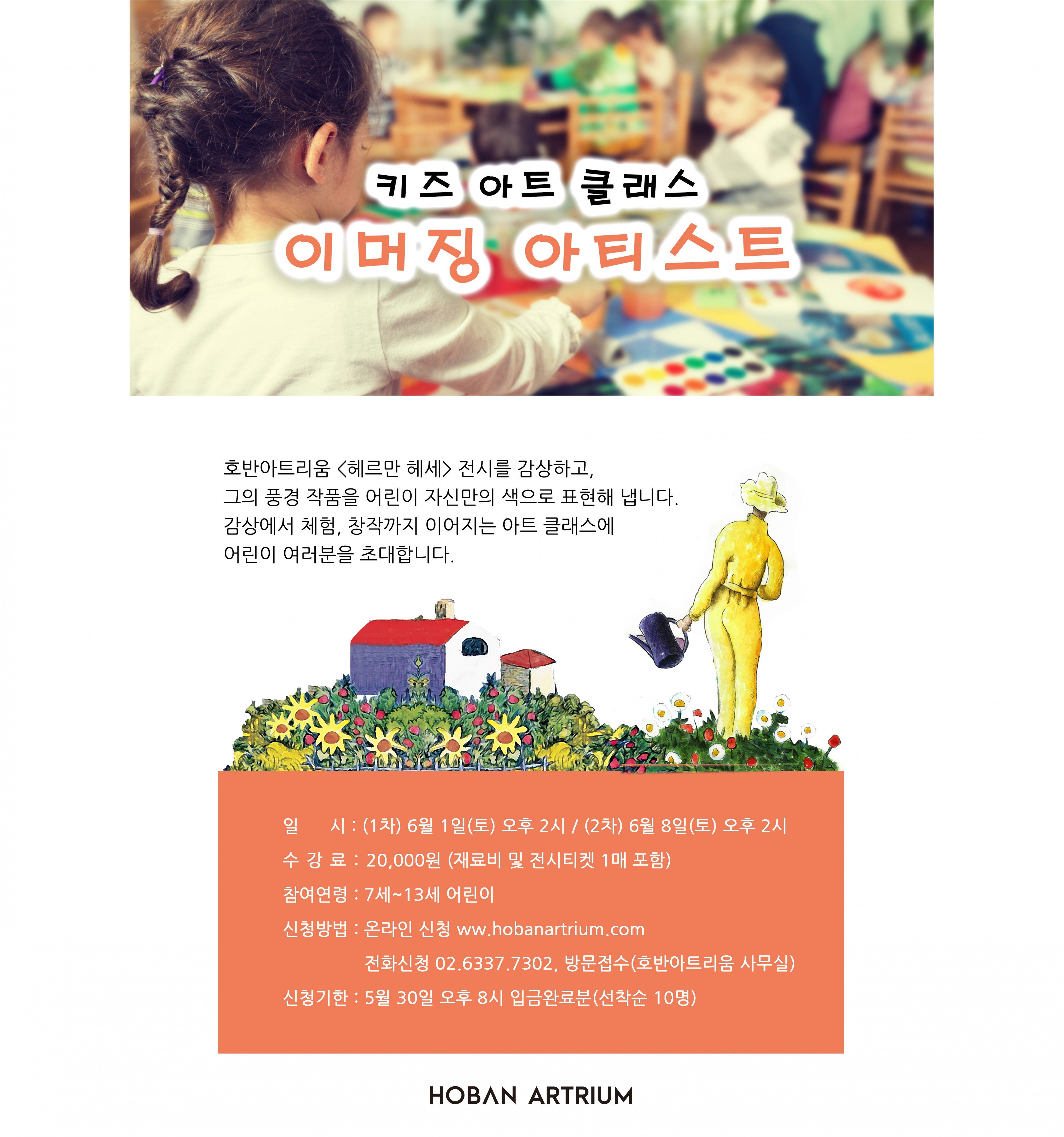 ●일 시 : 6월 1일(토) 오후 2시●수 강 료 : 20,000원 (재료비 및 전시티켓 1매 포함)●참여연령 : 7세~13세 어린이●준 비 물 : 앞치마, 토시●강의구성 : 전시감상 + 꼴라주 및 페인팅 체험●신청방법 : 온라인 신청 www.hobanartrium.com / 전화신청 02.6337.7302●신청기한 : 선착순 10명 마감 (5월 30일 오후 8시 입금완료분에 한함)